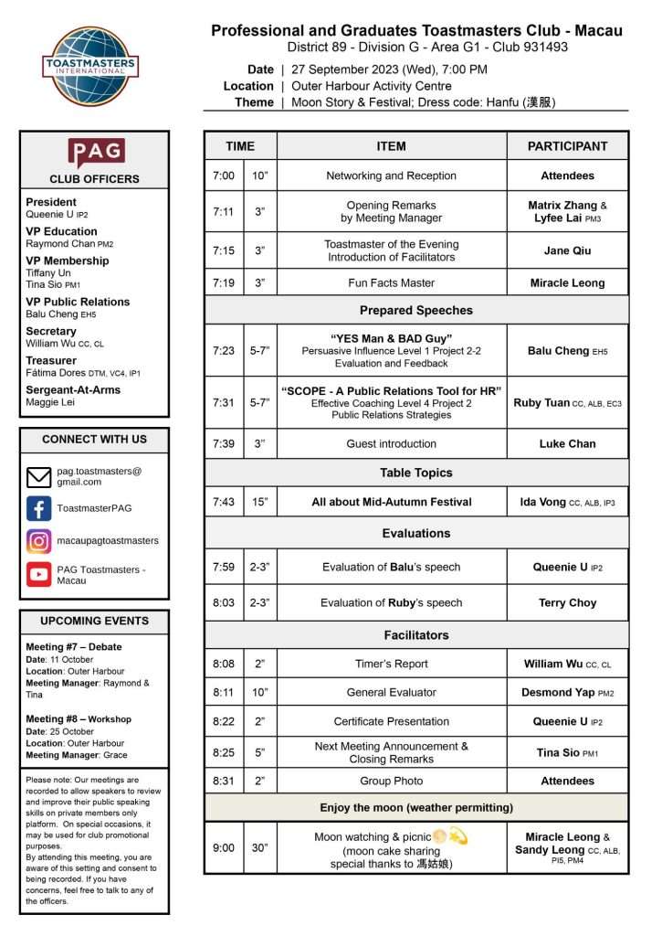 Meeting Writeup The Toastmasters meeting was filled with warmth and excitement as we celebrated the Mid-Autumn Festival. Our Meeting Managers Matrix & Lyfee gave us the opening remarks, welcoming all